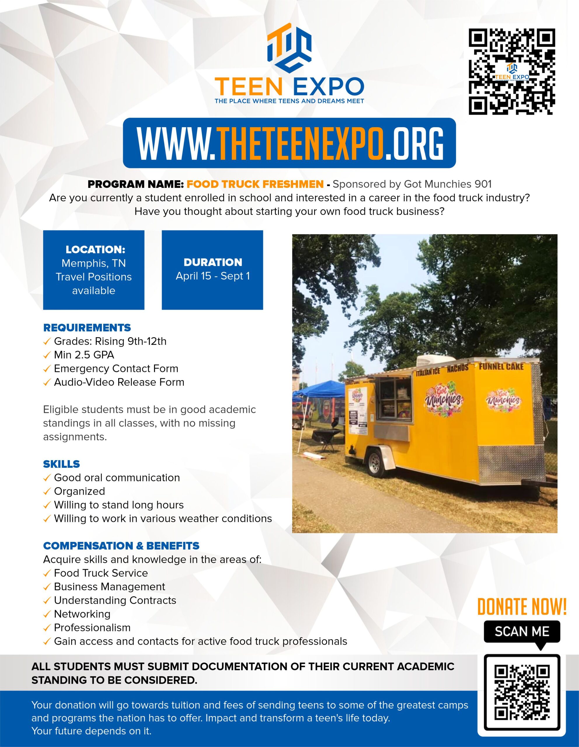 Join the Teen Expo and Got Munchies 901 as we open the opportunities for teens to gain hand on experience in the Food Truck Industry.  Got Munchies 901 Food Truck is home of the funnel cakes, Italian ice, nachos, and more.  Requirements The student must not have any outstanding assignments (late work), chronic absences, or …